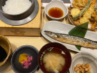 ☆焼き秋刀魚 ☆秋の天ぷら盛り合わせ ☆小鉢 ☆ご飯 ☆味噌汁 ☆漬物