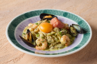 ⇒あさり、ムール貝、エビのジェノベーゼクリームソースに、たらこをトッピング。