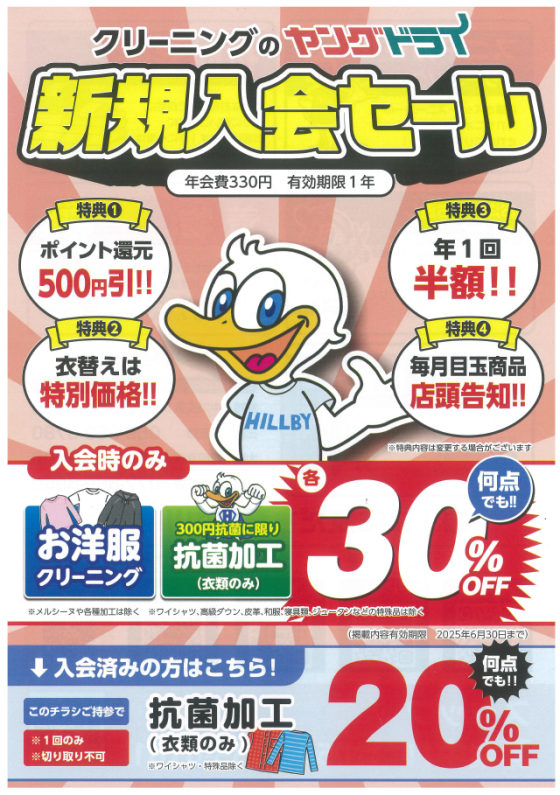 ヒルビー君でおなじみのクリーニング店、ヤングドライへようこそ! ヤングドライは、ワイシャツから布団や絨毯、カーテンから靴まで、 暮らしをまるごとクリーニングできるあなたのサポーターです。 大好評のふとん丸洗いは、気になるダニやカビもすっきりキレイに。掛け布団・敷布団・羽毛布団など毎日使う布団のクリーニングで、家族の健康を守ります。 ヤングドライイオンタウン熱田千年店へ、どうぞお気軽にご相談ください。