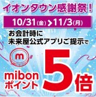 10/31(金)~11/3(月祝)の期間、イオンタウンで営業している未来屋書店10店舗で商品をご購入の際、未来屋書店アプリの掲示でmibonポイントが通常の5倍付与されます。