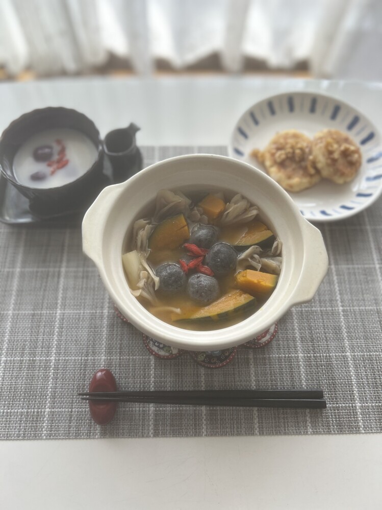 今回は「ほうとう風黒ごま団子スープ・手作りがんも・デザート」をご案内します。