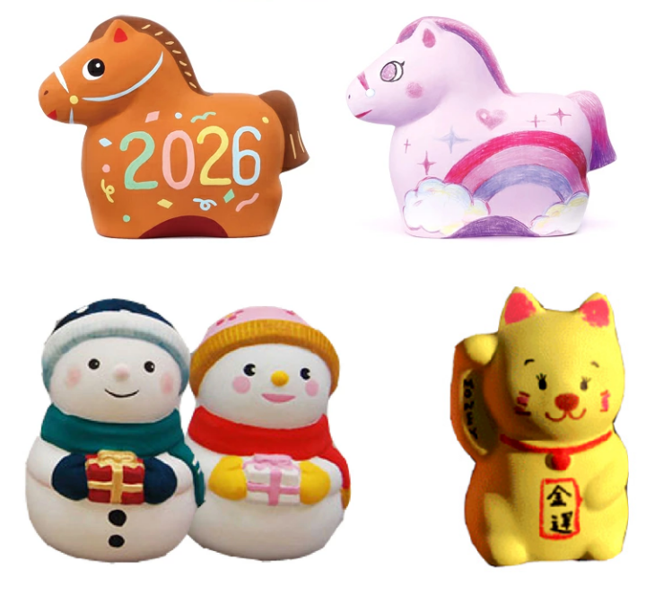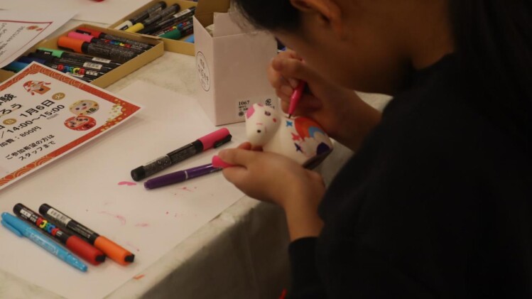 馬、雪だるま、招き猫、だるまの形をした素焼きでできた貯金箱にマジック等で好きな色に塗って楽しむ絵付け体験です。
