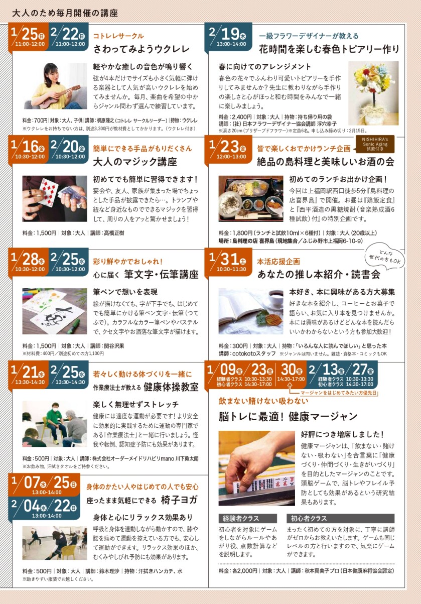 ※満席の講座も増えております。当日参加を思い立たれた場合、必ず電話または、WEBにて空席状況をご確認いただけると幸いです。