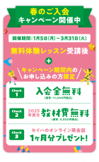 新年度からの教室探しも良いのですが、人気クラスは満員でご案内が難しいこともございます。 今時期ご入会いただくと、既存生として優先的に新年度クラスをご案内できる場合が多いです。 特に現在、年少・年中・小1・小2のお子さんは春からもセイハで同じレベルのクラスになるので、教室の雰囲気に慣れてから新年度を迎えられてご家族もご安心かと思います♪