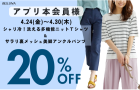 4/24(金)~4/30(木)は「シャリ冷!洗える多機能ニットTシャツ」&「サラリ裏メッシュ美脚アンクルパンツ」がアプリ本会員様限定20%OFF!