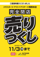 2025.10.12 実施期間:11月3日(月祝)まで メガスポーツ 閉店売り尽くし 前の記事 次の記事 一覧ページへ A街区1F グッズ メガスポーツアウトドアステージ西熊本店 営業時間 10:00~21:00 電話番号 096-312-3711