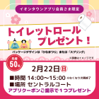開催前 イオンタウンイベント トイレットロールプレゼント! 実施期間 2026.2.22 ~ 2026.2.22 時間 14:00~15:00(なくなり次第終了) 場所 セントラルコート 先着50名さま イオンタウンアプリクーポンご提示で 『トイレットロール』を1つプレゼント! ※おひとりさま1回限り / 1アカウント(1端末)につき1回限りのご利用となります。 ※ご利用前にクーポン画面を「使用済み」にされた場合は無効となりますのでご注意ください。 ▼イオンタウンアプリのダウンロードはこちらから! 一覧ページへ