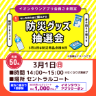 開催前 イオンタウンイベント 防災グッズ抽選会 実施期間 2026.3.1 ~ 2026.3.1 時間 14:00~15:00(景品がなくなり次第終了) 場所 セントラルコート 先着50名さま 3月1日は「防災用品点検の日」 もしものために備えましょう! 【参加条件】①②両方ご提示で1回参加 ①当日お買い上げレシート税込1,000円以上 ②イオンタウンアプリクーポン ※おひとりさま1回限り / 1アカウント(1端末)につき1回限りのご利用となります。 ※ご利用前にクーポン画面を「使用済み」にされた場合は無効となりますのでご注意ください。 ▼イオンタウンアプリのダウンロードはこちらから! 一覧ページへ