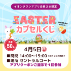 開催前 イオンタウンイベント イースターカプセルくじ 実施期間 2026.4.5 ~ 2026.4.5 時間 14:00~15:00(景品がなくなり次第終了) 場所 セントラルコート 先着50名さま 何が当たるかドキドキ♪ カプセルに入ったくじの結果に応じて景品GET! イオンタウンアプリクーポンご提示で1回参加 ※おひとりさま1回限り / 1アカウント(1端末)につき1回限りのご利用となります。 ※ご利用前にクーポン画面を「使用済み」にされた場合は無効となりますのでご注意ください。 ▼イオンタウンアプリのダウンロードはこちらから! 一覧ページへ