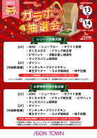 レシート対象期間中のイオンタウン田崎対象専門店または、マックスバリュでのお買い上げレシート税込3,000円毎に1回、ガラポン抽選会にご参加いただけます。