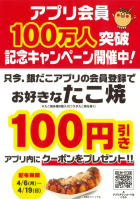内容:期間中、「銀だこアプリ」 をダウンロードし会員登録していただいた方に、お好きなたこ焼(8個入り)100円引きクーポン をプレゼント(銀だこアプリ内のクーポン)