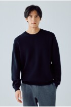 ミラノリブのシンプルなクルーネックセーターで、衿にワンポイントを入れています。
